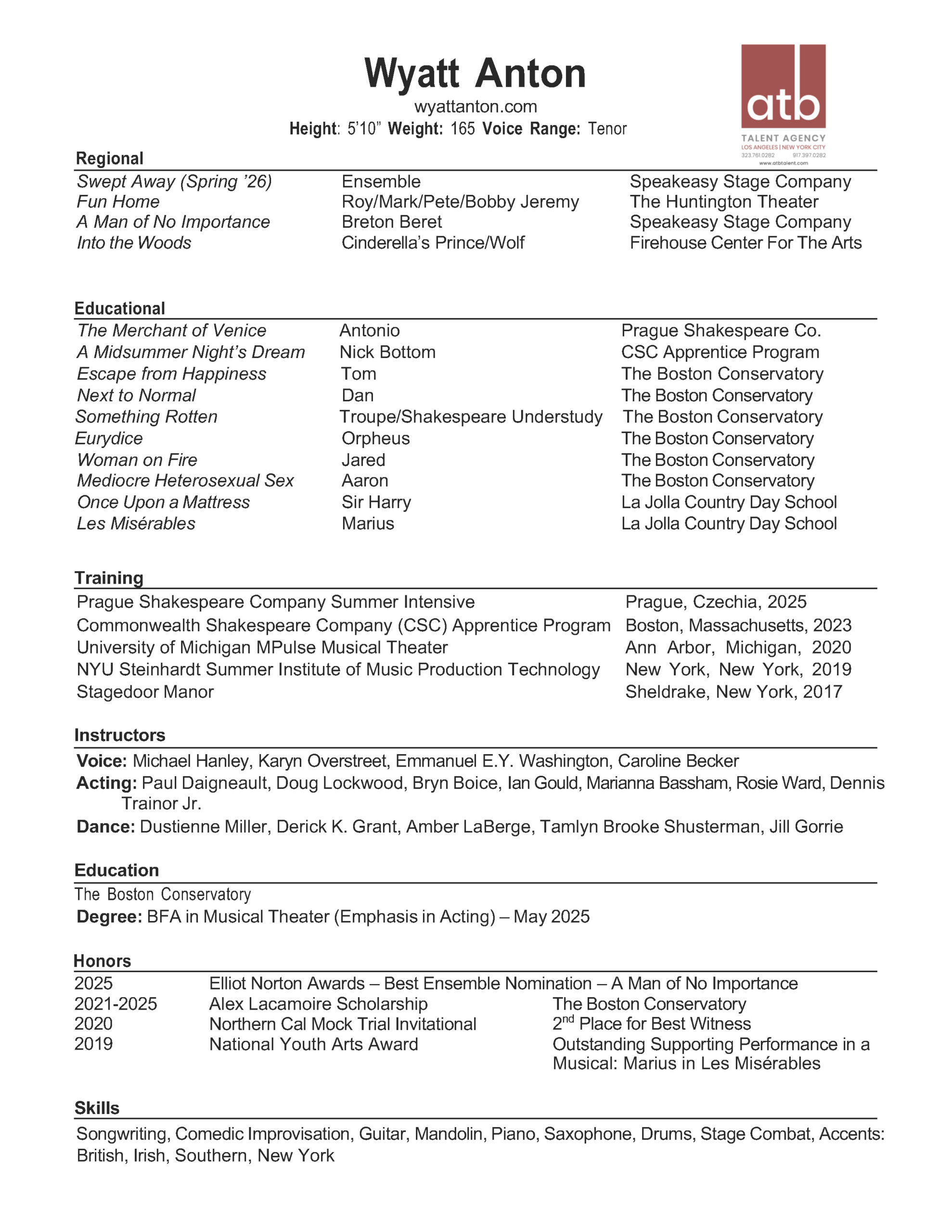 Wyatt Anton is a dynamic actor and vocalist currently based in New York City, who graduated in 2025 with a BFA in Musical Theater from Boston Conservatory at Berklee. Originally from San Diego, Wyatt brings a west coast warmth to his deeply rooted East Coast training. He is passionate about honest, character-driven storytelling and has performed in a wide range of productions, from intimate scene work to large-scale musicals.
